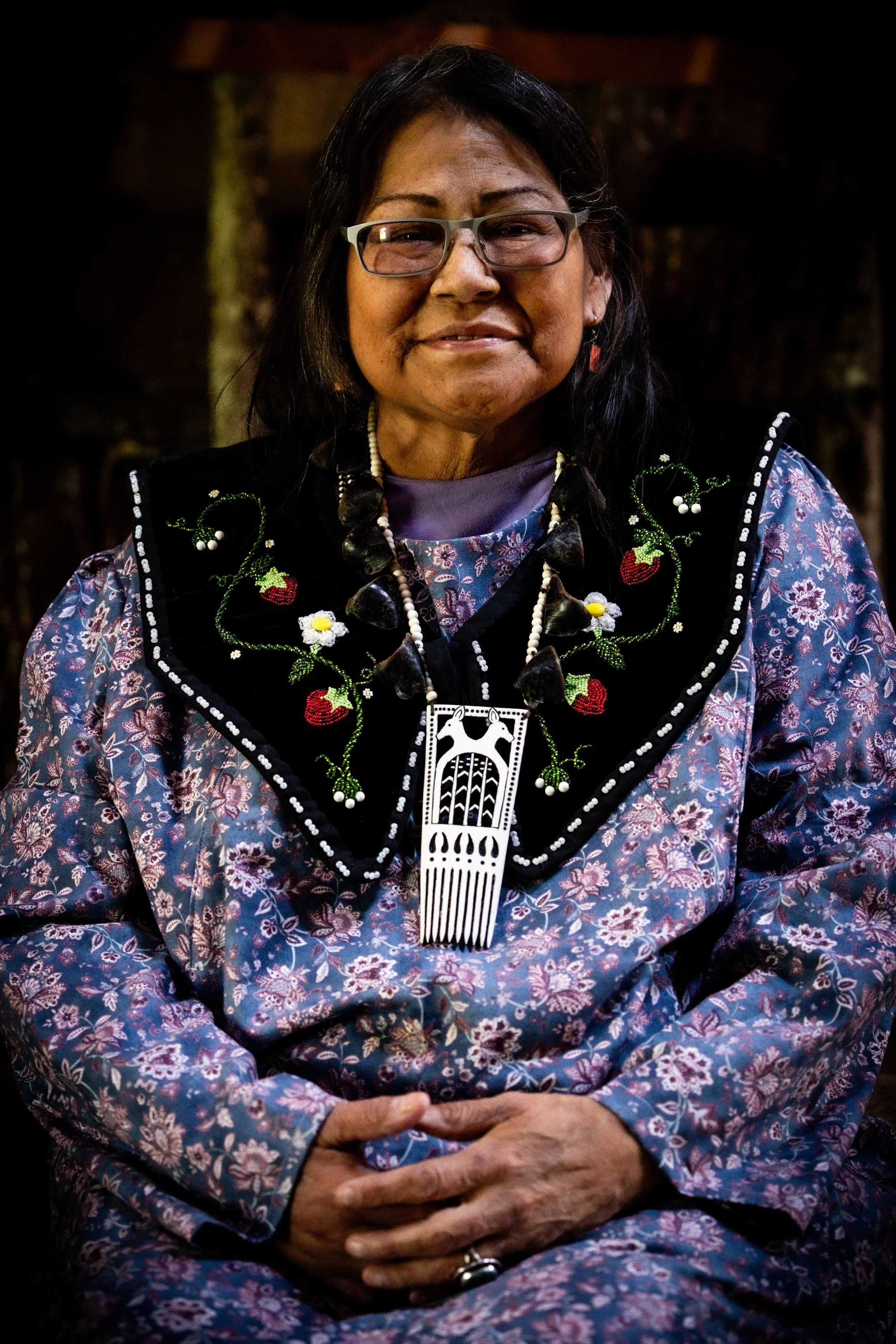 Portrait of Seneca Name Giver, Alexia John, wearing Hodi’nyögwai:yö’ (They are Deer Clan) necklace by Hayden Haynes